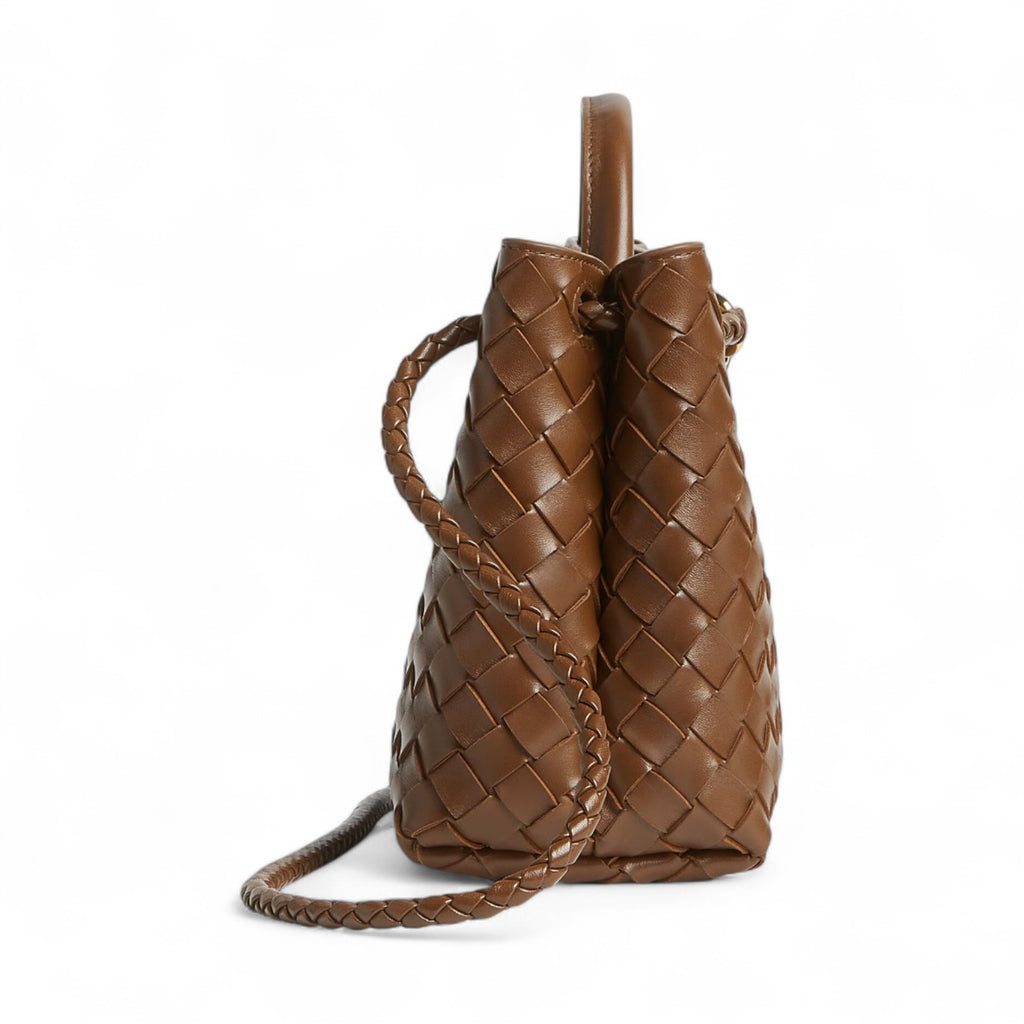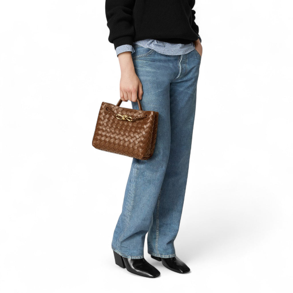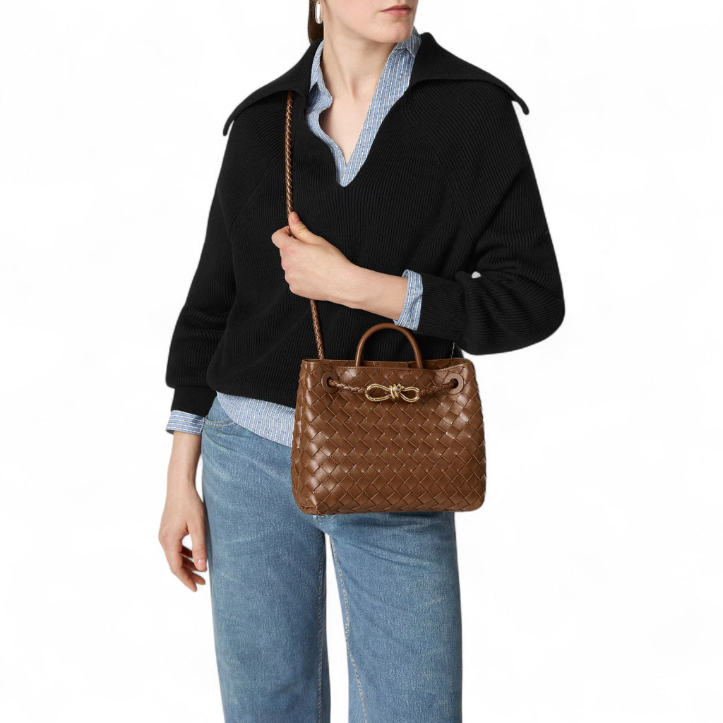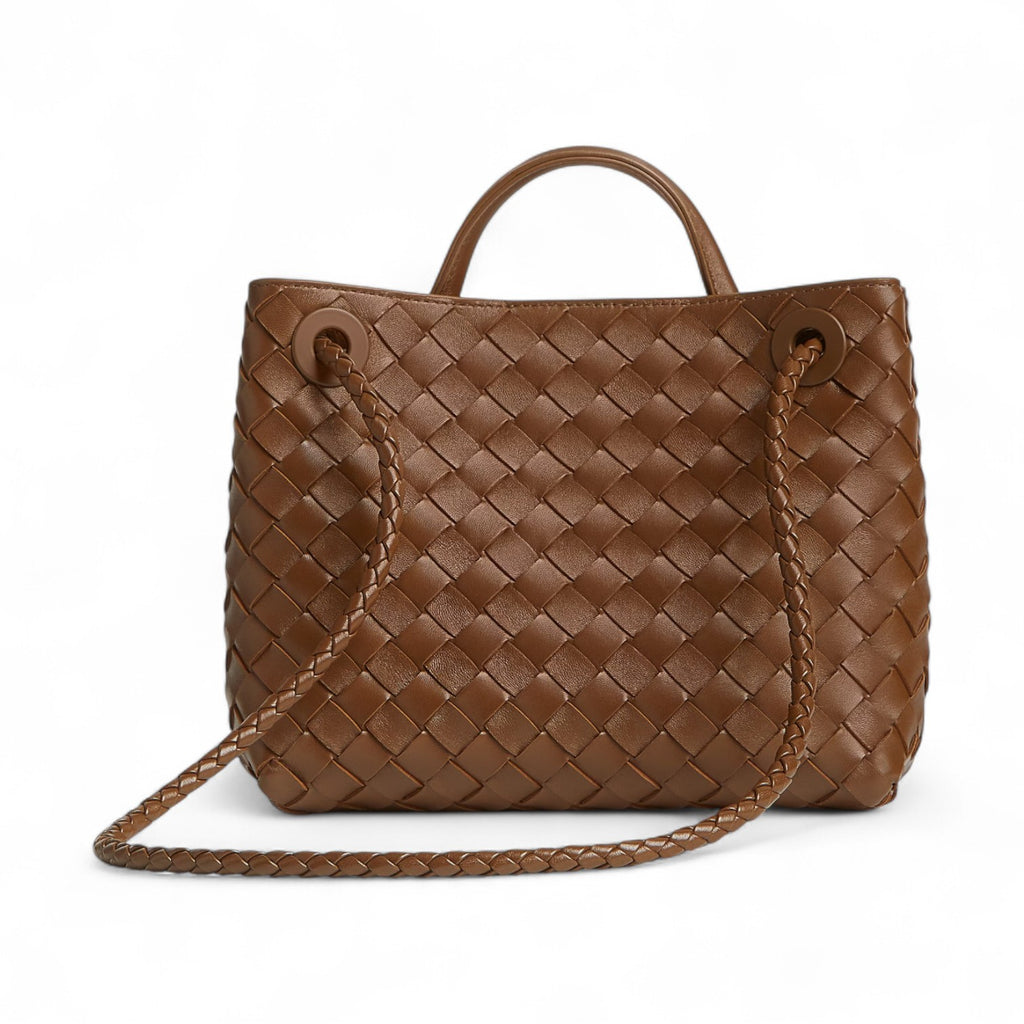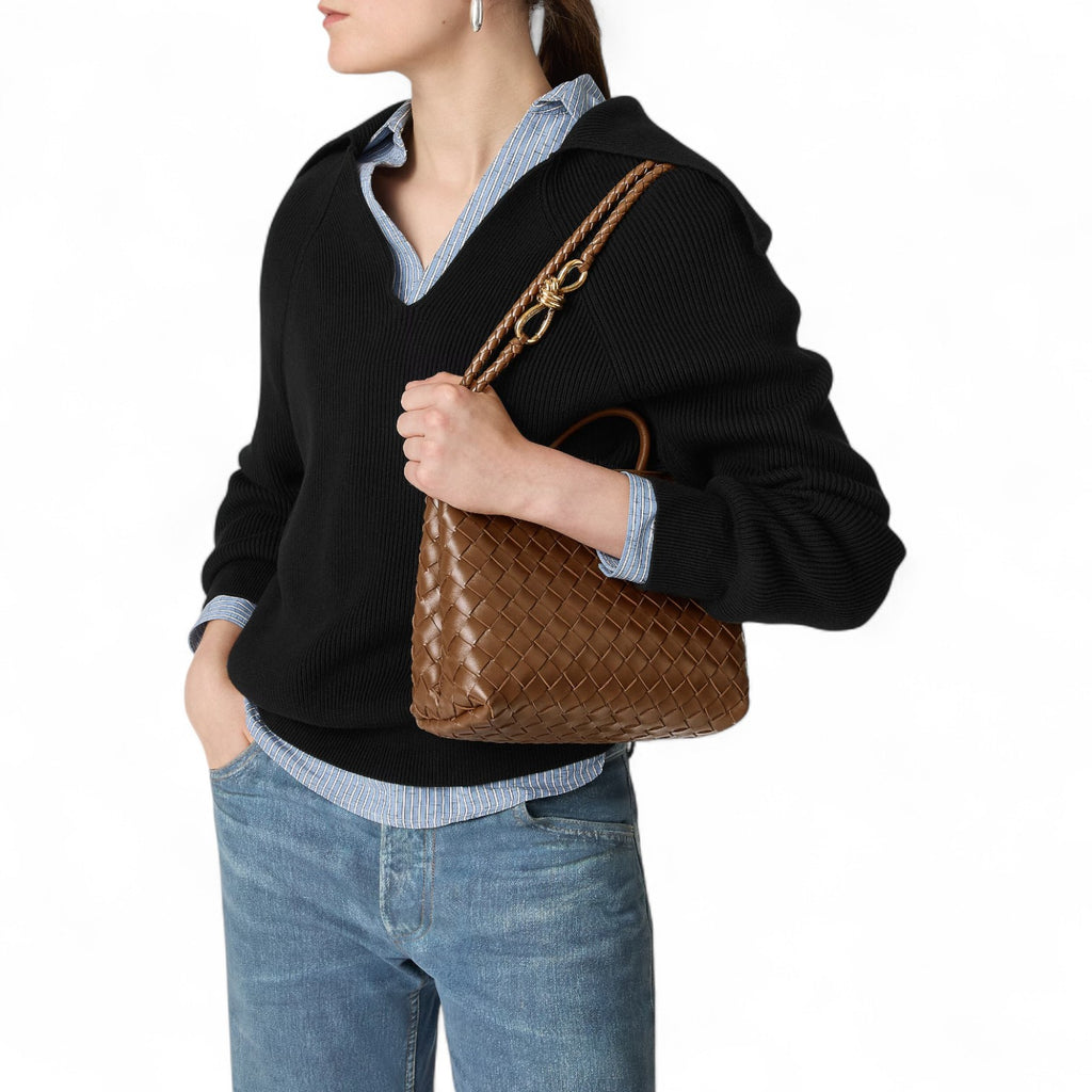 - حقيبة صغيرة من الجلد المجدول بمقبض علوي وحزام منزلق للحمل عبر الجسم