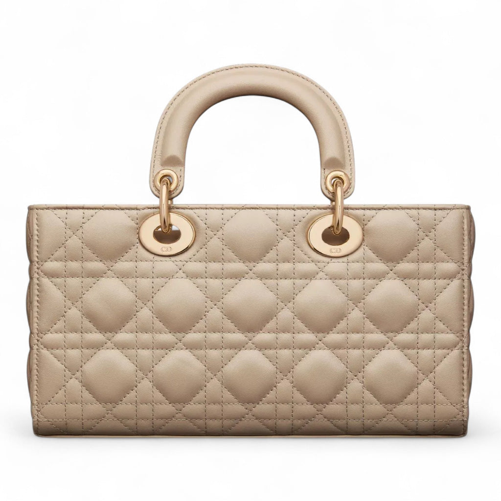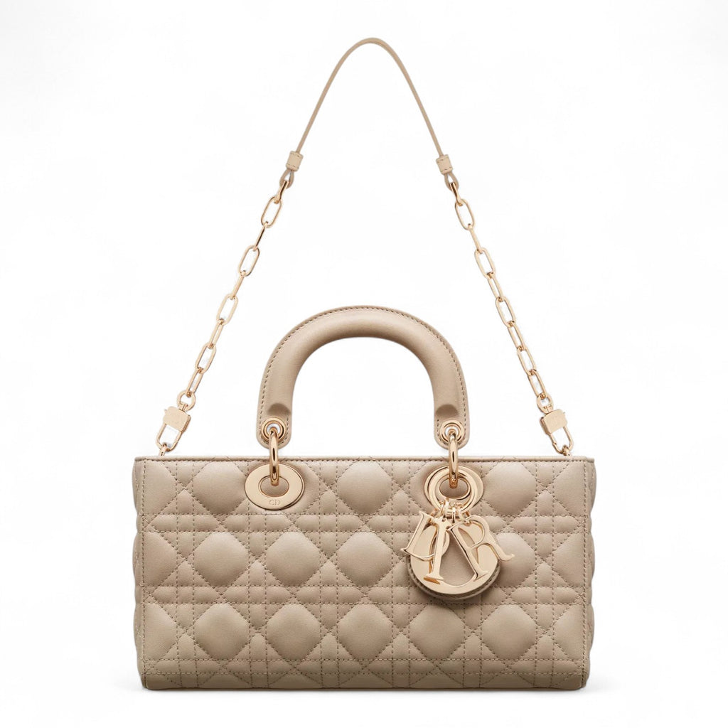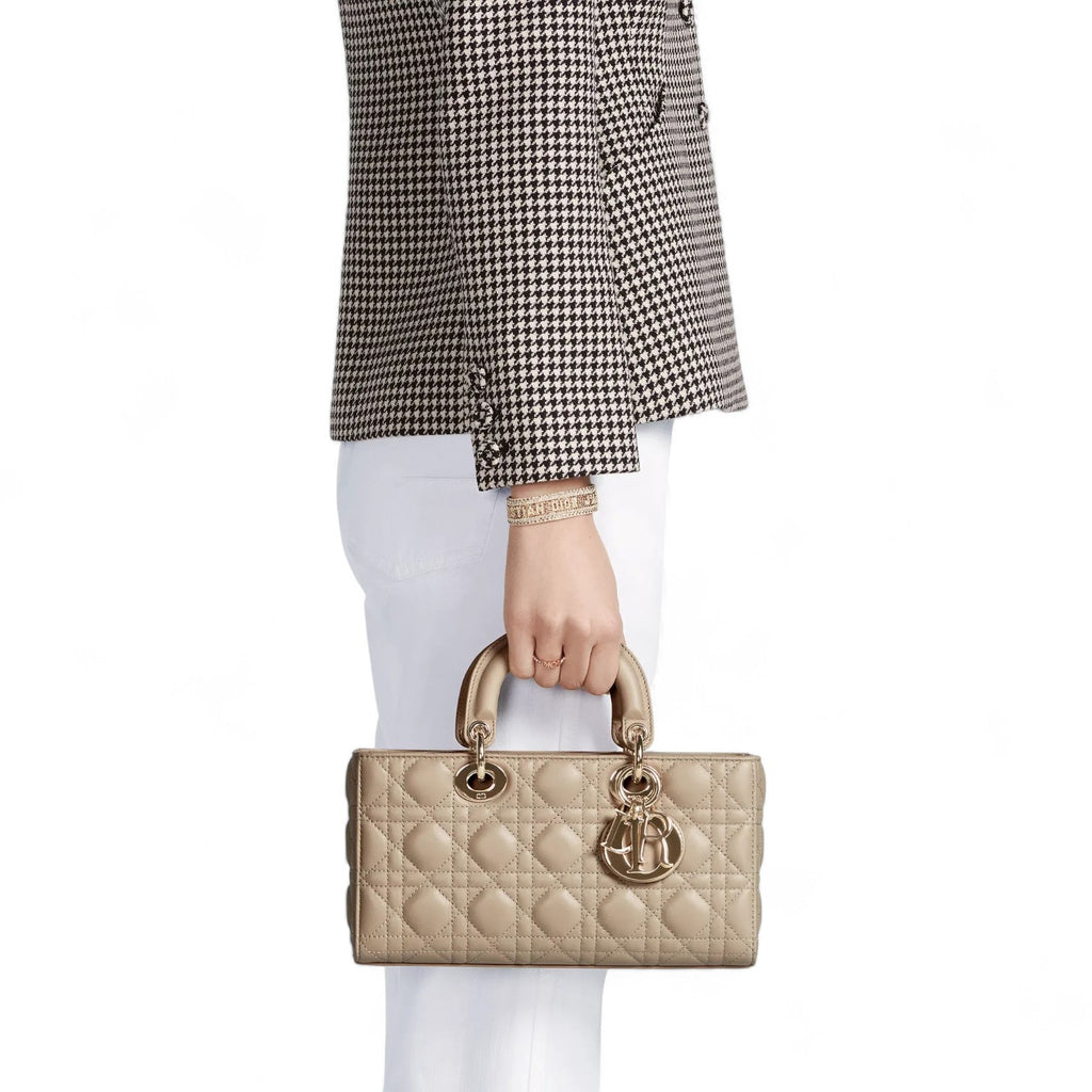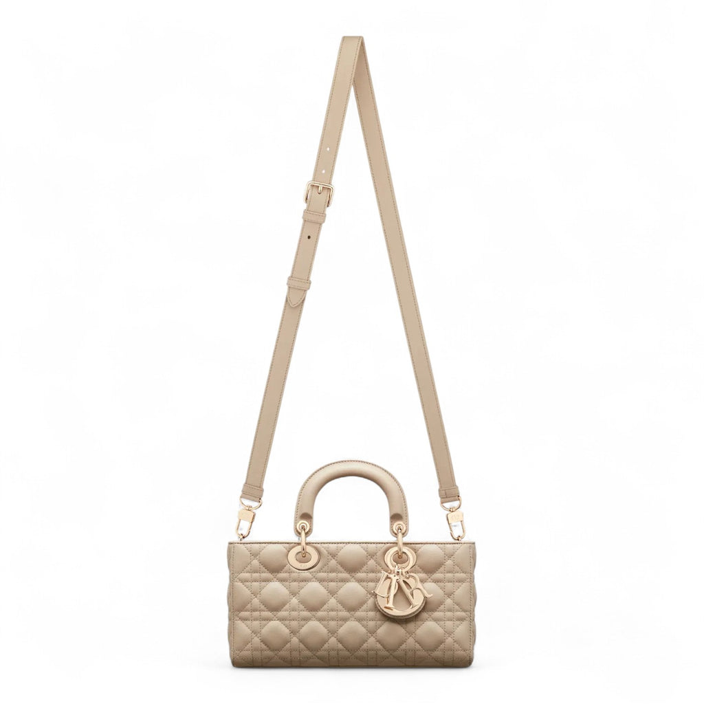 تُجسّد حقيبة ليدي دي-جوي رؤية الدار للأناقة والجمال. بتصميمها الأنيق والراقي، تُجسّد هذه الحقيبة الخالدة الجمالية الانسيابية الأيقونية لسلسلة ليدي ديور. صُنعت من جلد حمل بلون رملي مع تطريز كاناج، وتزيّنها حُلي ديور المعدنية بلمسة ذهبية باهتة تُزيّن تصميمها. تتميز حقيبة ليدي دي-جوي المتوسطة بحزام كتف قابل للفصل وحزام كتف جلدي آخر قابل للتعديل والإزالة، ويمكن حملها باليد أو حملها كحقيبة كروس بودي كرفيقة يومية.