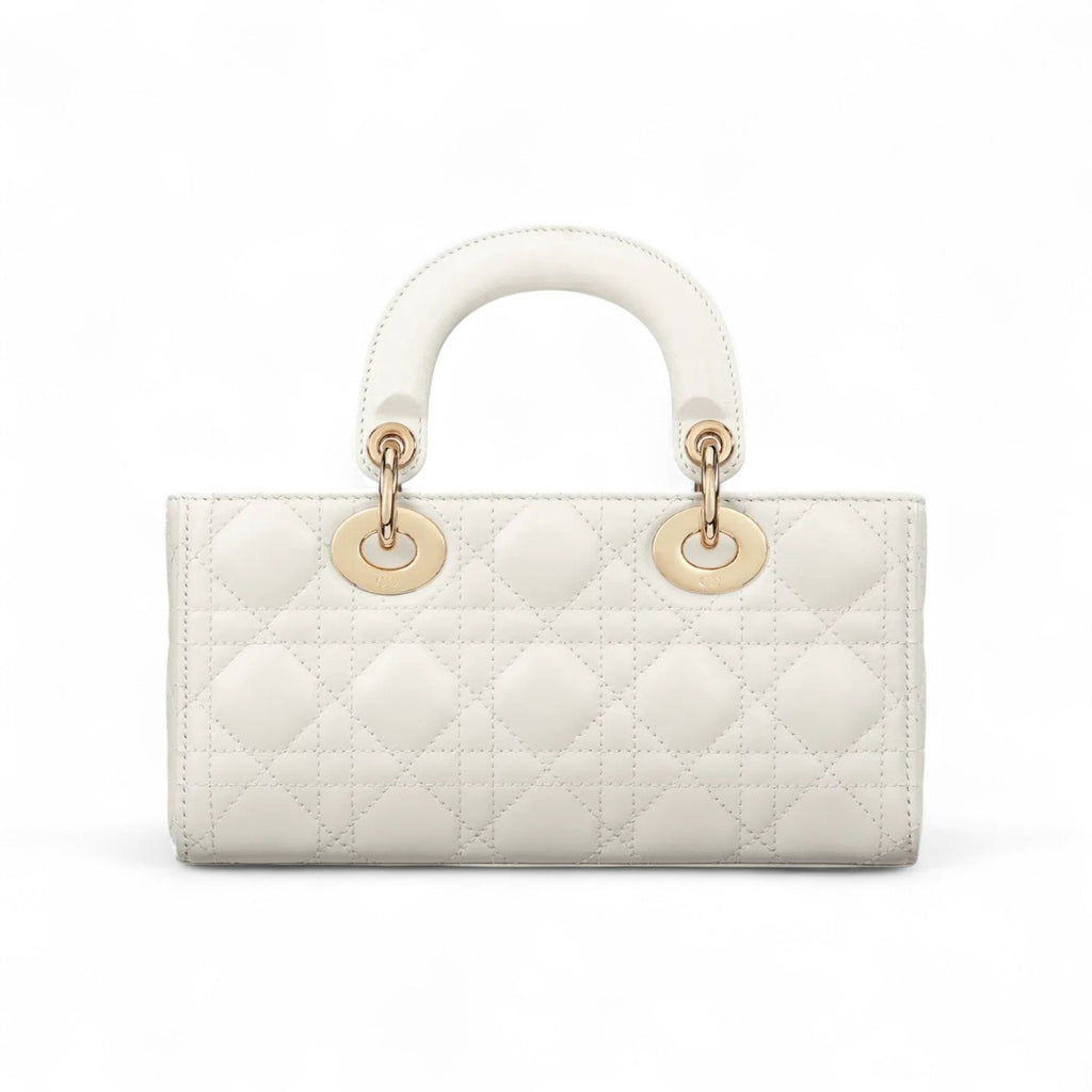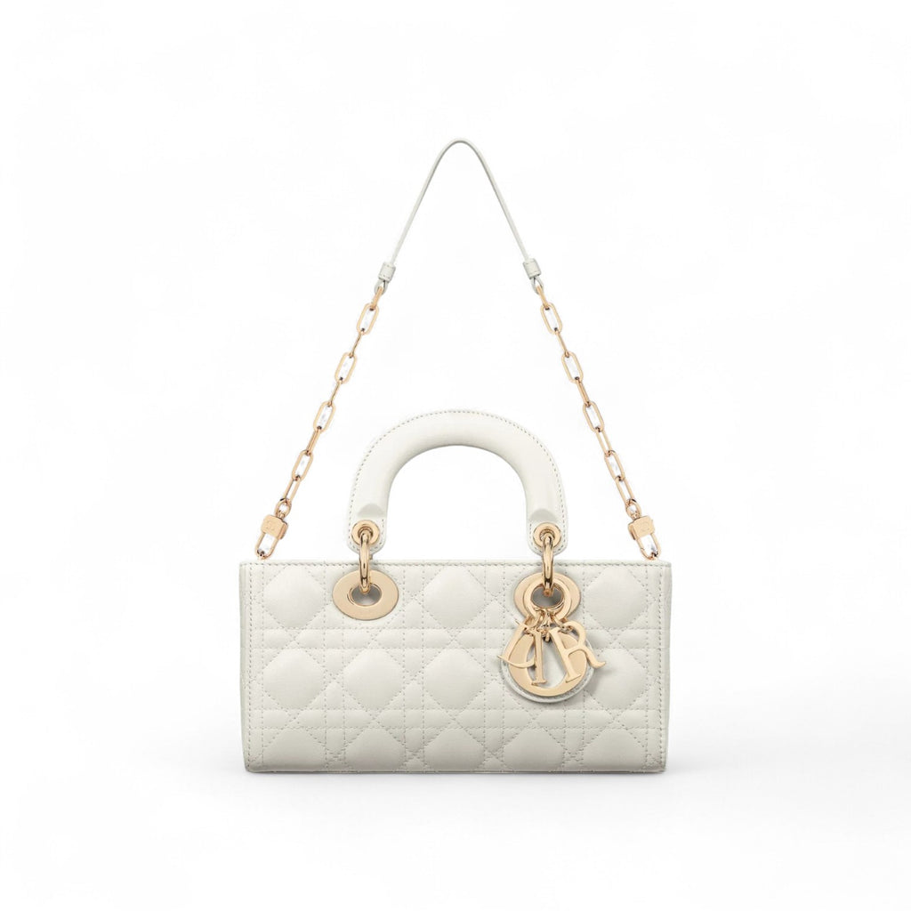 حقيبة ليدي دي-جوي، الجديدة لشتاء 2025، تُجسّد رؤية الدار للأناقة والجمال من خلال إبراز الجمالية الانسيابية الأيقونية لسلسلة ليدي ديور. صُنعت من جلد حمل بلون لاتيه مع تطريز كاناج، ويتألق تصميمها الراقي والخالدي بحليات ديور المعدنية ذات اللمسة الذهبية الباهتة. تتميز حقيبة ليدي دي-جوي المصغّرة بحزام سلسلة قابل للفصل وآخر جلدي قابل للتعديل والإزالة، ويمكن حملها باليد أو على الكتف أو عبر الجسم كرفيقة يومية.