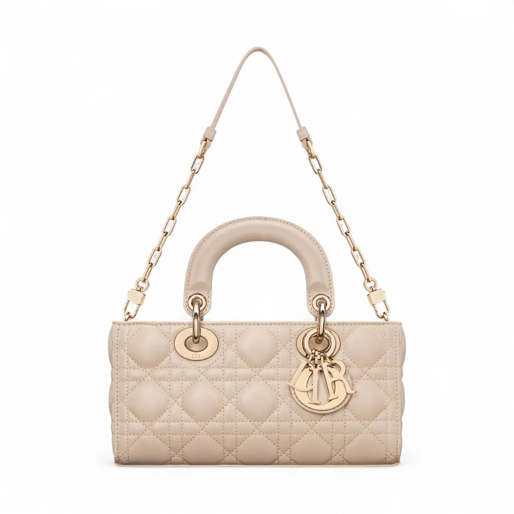 تُجسّد حقيبة ليدي دي-جوي رؤية الدار للأناقة والجمال من خلال إبراز الجماليات الانسيابية الأيقونية لسلسلة ليدي ديور. صُنعت من جلد حمل بلون لاتيه مع تطريز كاناج، ويكتمل تصميمها الراقي والخالدي بحليات ديور المعدنية ذات اللمسة الذهبية الباهتة التي تُضفي لمسةً من التألق على تصميمها. تتميز حقيبة ليدي دي-جوي الصغيرة بحزام سلسلة قابل للفصل وآخر جلدي قابل للتعديل والإزالة، ويمكن حملها باليد أو على الكتف أو كحقيبة كروس كرفيقة يومية.