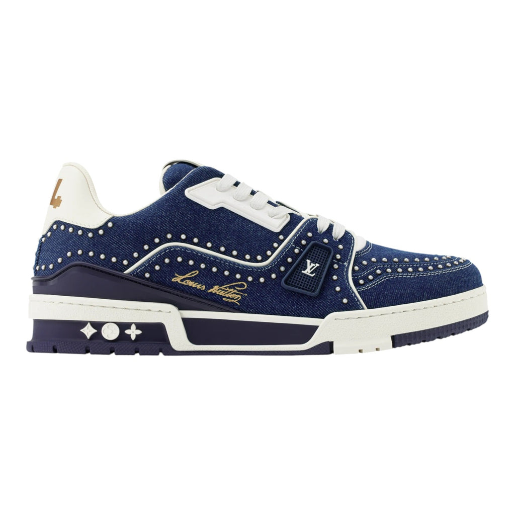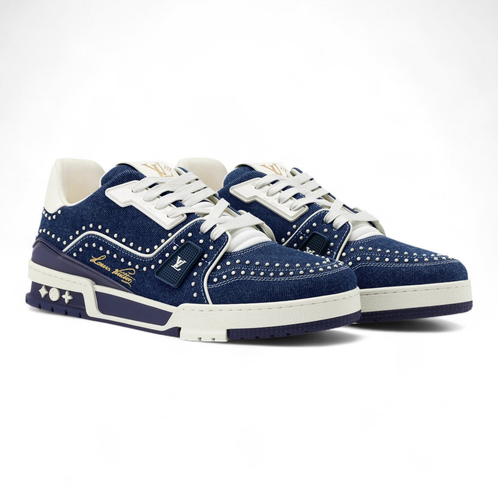 حذاء رياضي رجالي من لويس فيتون، أزرق اللون، من قماش الدنيم بنقشة مخطوطة، مرصع بلآلئ سواروفسكي