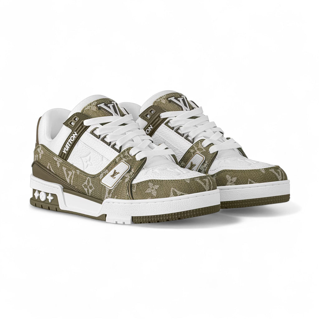 حذاء رياضي رجالي من LOUIS VUITTON مصنوع من جلد العجل المحبب بنقشة مونوغرام من قماش الدنيم بلون الكاكي