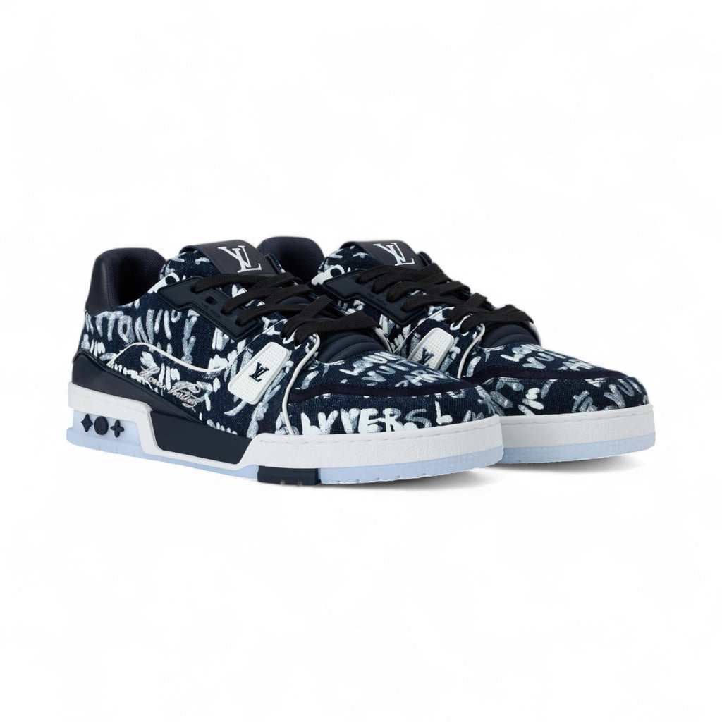 حذاء رياضي رجالي من قماش الدنيم مطبوع عليه خطوط من لويس فيتون باللون الأزرق