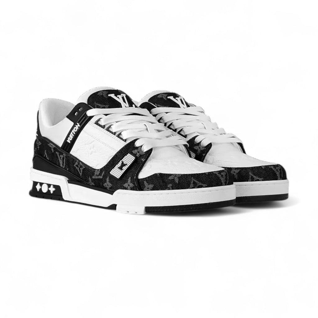 حذاء رياضي رجالي من LOUIS VUITTON مصنوع من جلد العجل المحبب بنقشة مونوغرام من الدنيم باللون الأبيض
