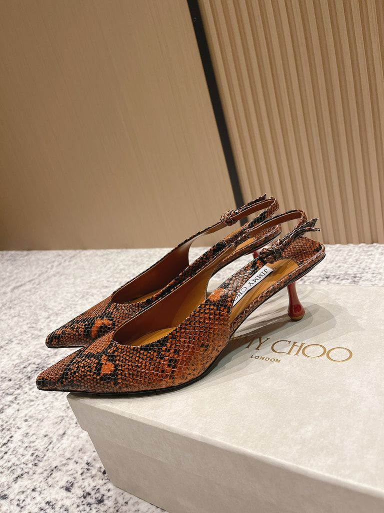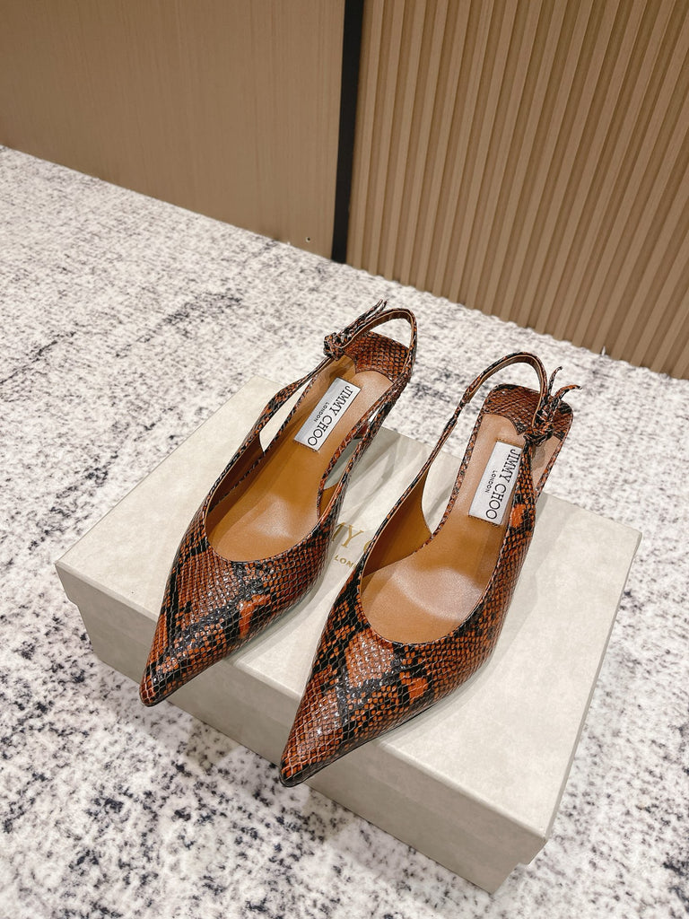 حذاء مفتوح من الخلف من الجلد البني مطبوع عليه جلد الثعبان من جيمي تشو كونياك كيغالي