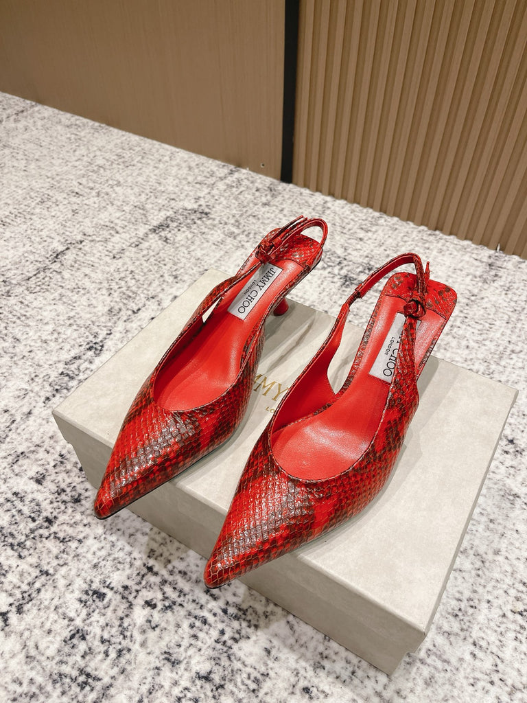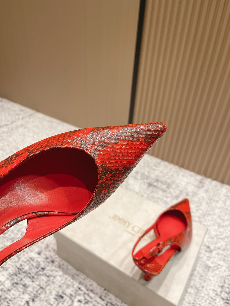 حذاء مفتوح من الخلف من الجلد الأحمر مطبوع عليه جلد الثعبان من جيمي تشو كونياك كيغالي
