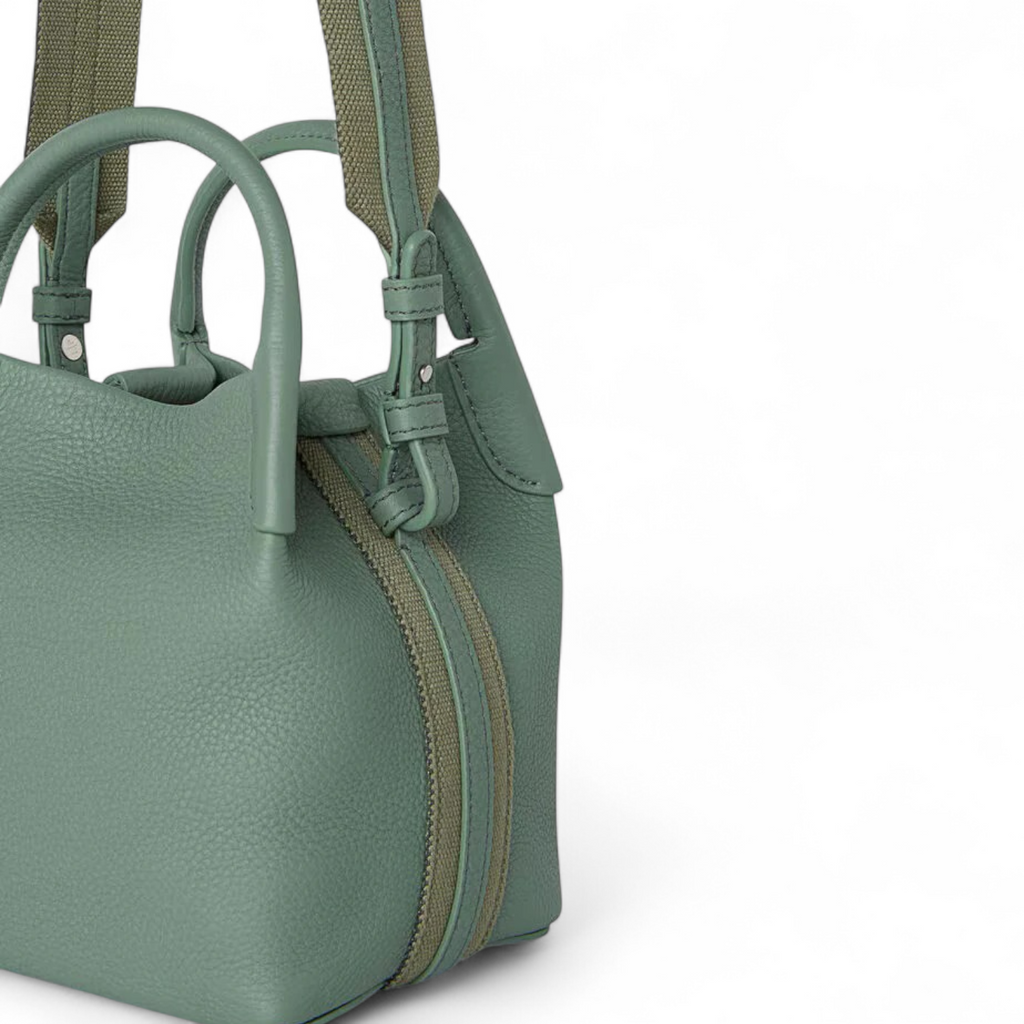يتميز حزام الكتف بفتحتين، بحيث يمكن تعديل طوله، مما يسمح بحمل الحقيبة باليد أو على الكتف أو على شكل حقيبة كروس بودي. قفل معدني داخلي بقفل دوار. جزء داخلي من الجلد السويدي مع حقيبة قابلة للإزالة تتناسب مع لون الحقيبة.