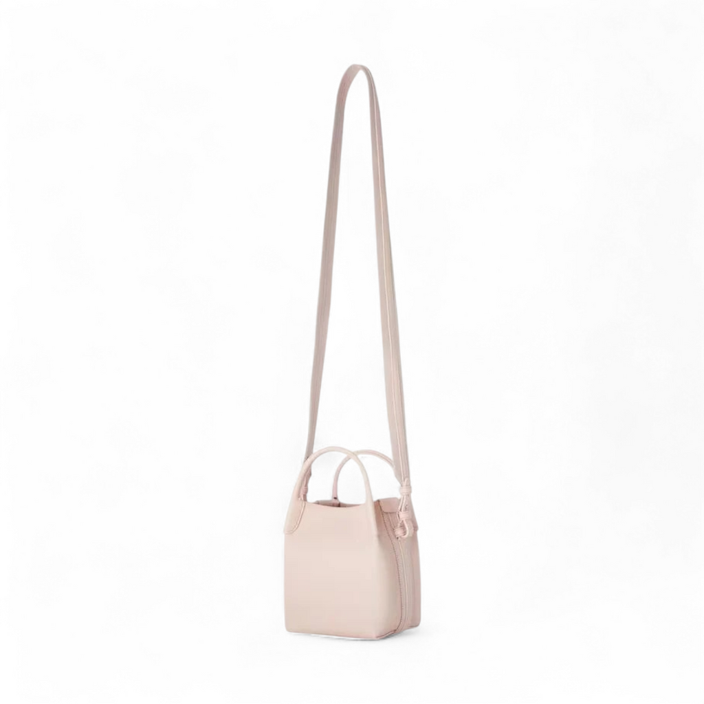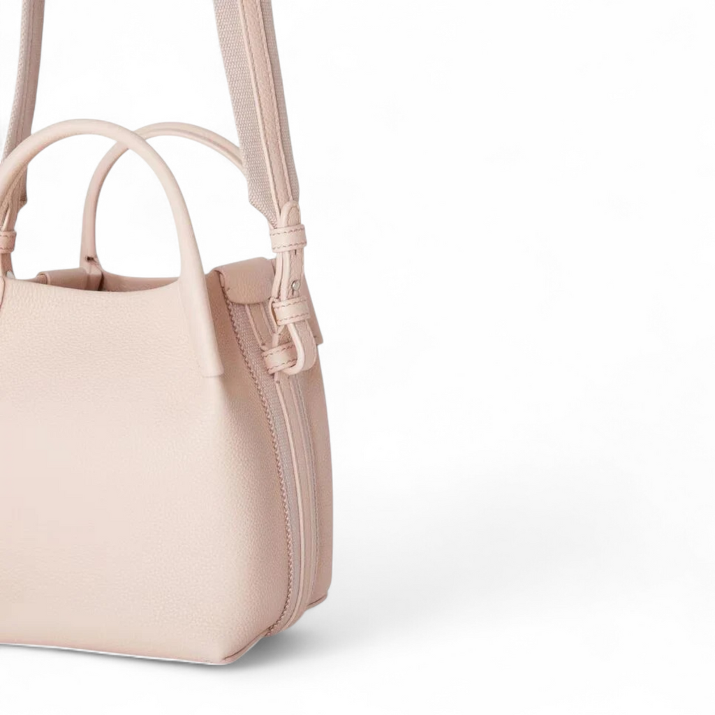 يتميز حزام الكتف بفتحتين، بحيث يمكن تعديل طوله، مما يسمح بحمل الحقيبة باليد أو على الكتف أو على شكل حقيبة كروس بودي. قفل معدني داخلي بقفل دوار. جزء داخلي من الجلد السويدي مع حقيبة قابلة للإزالة تتناسب مع لون الحقيبة.
