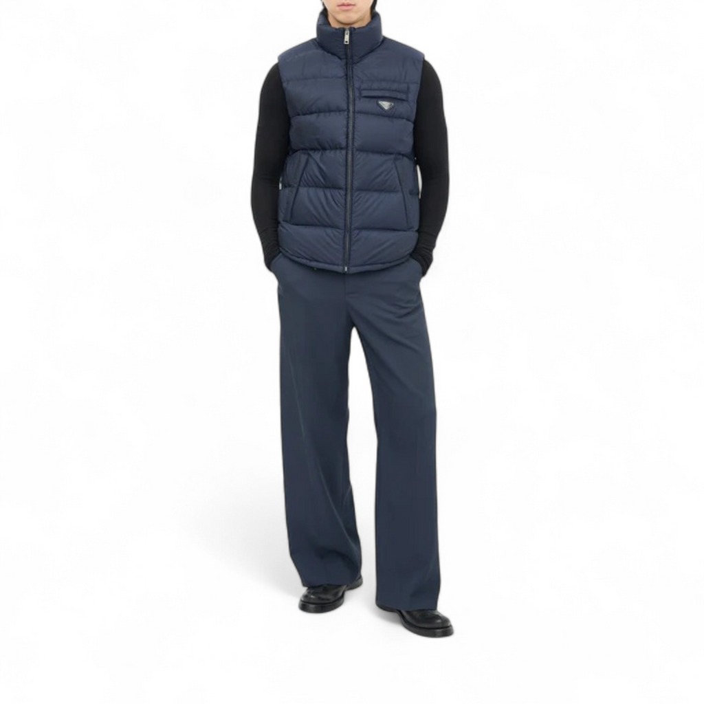 تتميز هذه السترة المبطنة بخطوط أنيقة، مصنوعة من قماش ري-نايلون المبتكر، المصنوع من بلاستيك مُعاد تدويره ونقي، جُمِع من المحيط. زُيِّنت هذه السترة بشعار مثلث معدني مطلي بالمينا.