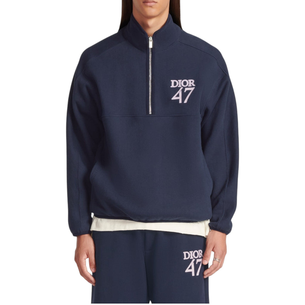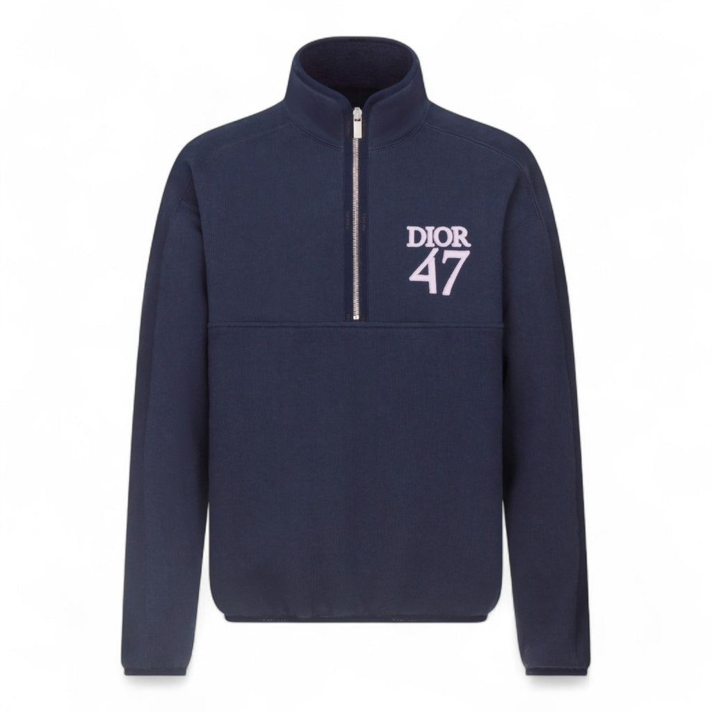 سويت شيرت ديور 47 مطرز بنصف سحاب للرجال باللون الأزرق الداكن