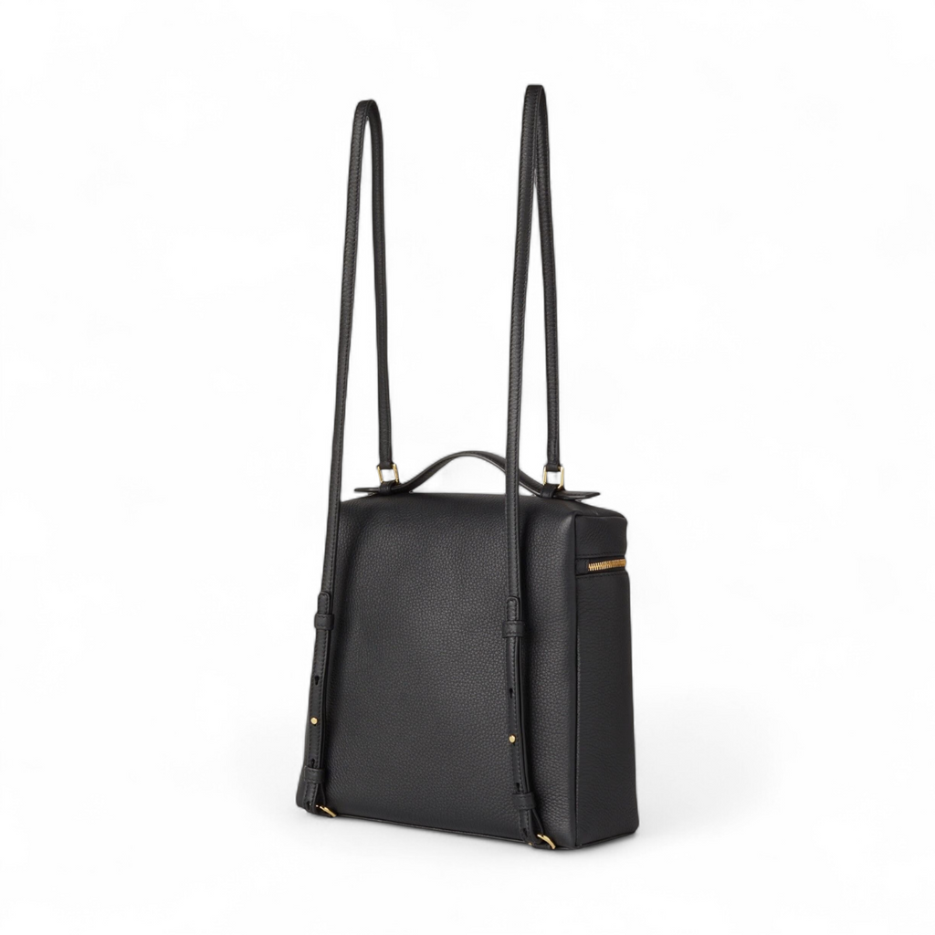 حقيبة ظهر نسائية من جلد العجل المحبب من لورو بيانا، باللون الأسود، بجيب إضافي، مقاس L23.5