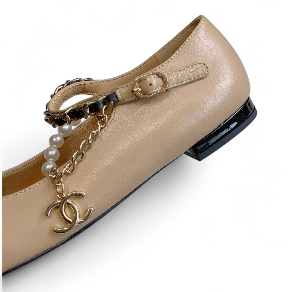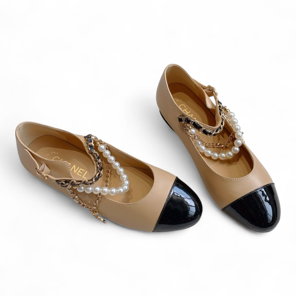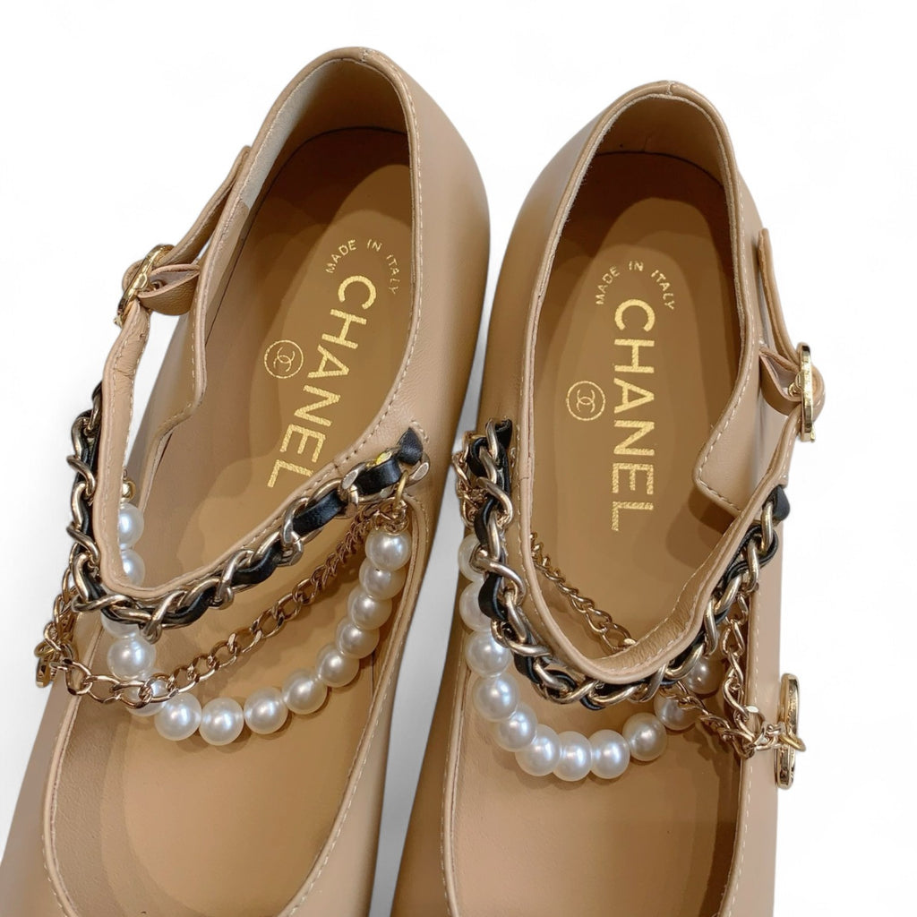 حذاء شانيل ماري جين مسطح من اللؤلؤ والمعادن باللون البيج الداكن - سيتم شحن لمقاس هذا المنتج خلا 15-30 يوم