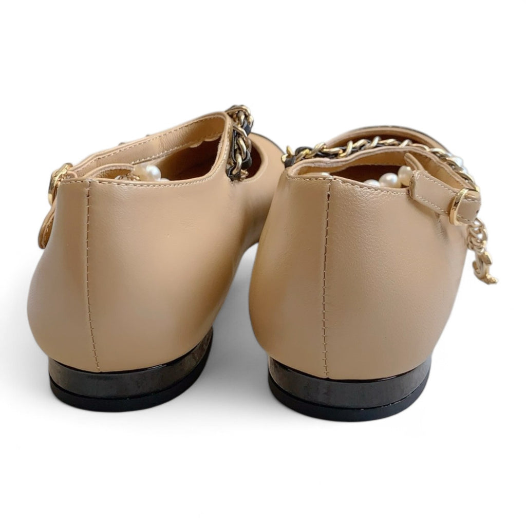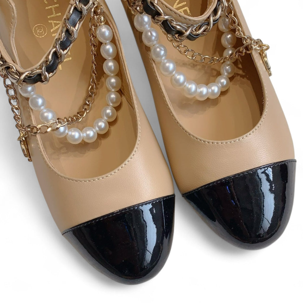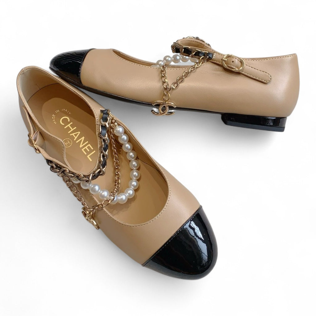 حذاء شانيل ماري جين مسطح من اللؤلؤ والمعادن باللون البيج الداكن - سيتم شحن لمقاس هذا المنتج خلا 15-30 يوم