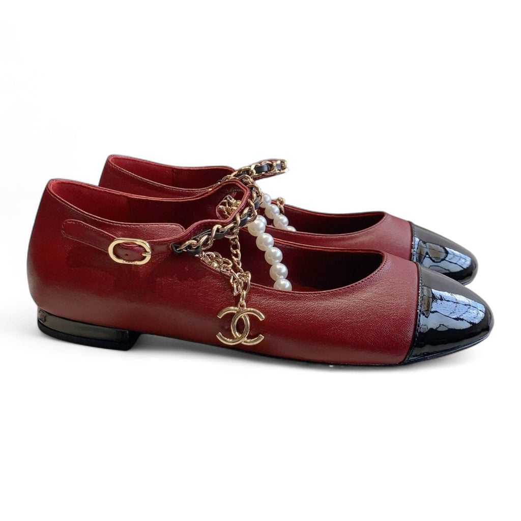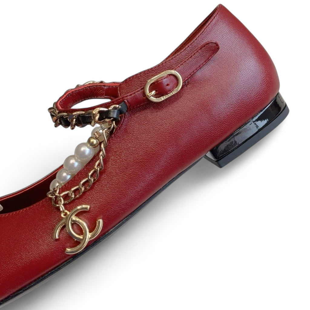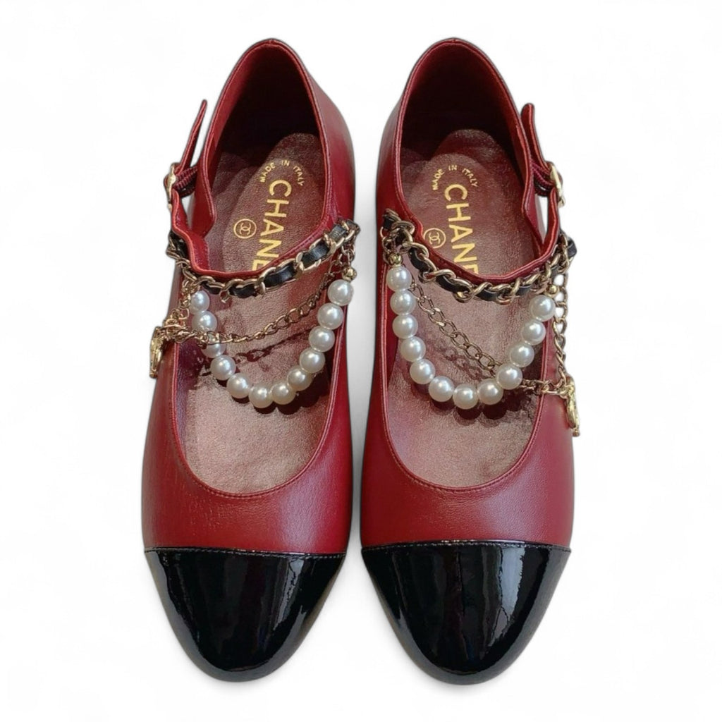 أحذية شانيل ماري جين الحمراء المسطحة باللؤلؤ والمعدن