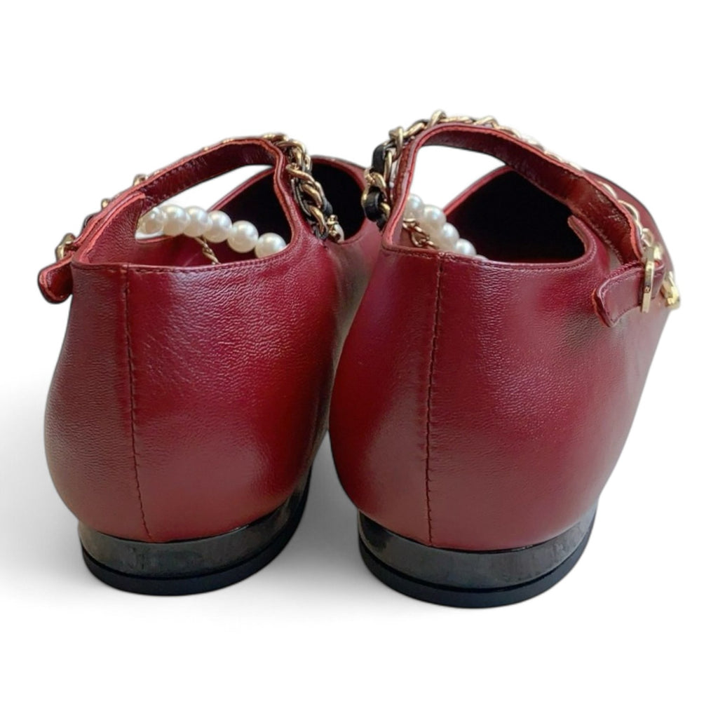 أحذية شانيل ماري جين الحمراء المسطحة باللؤلؤ والمعدن -