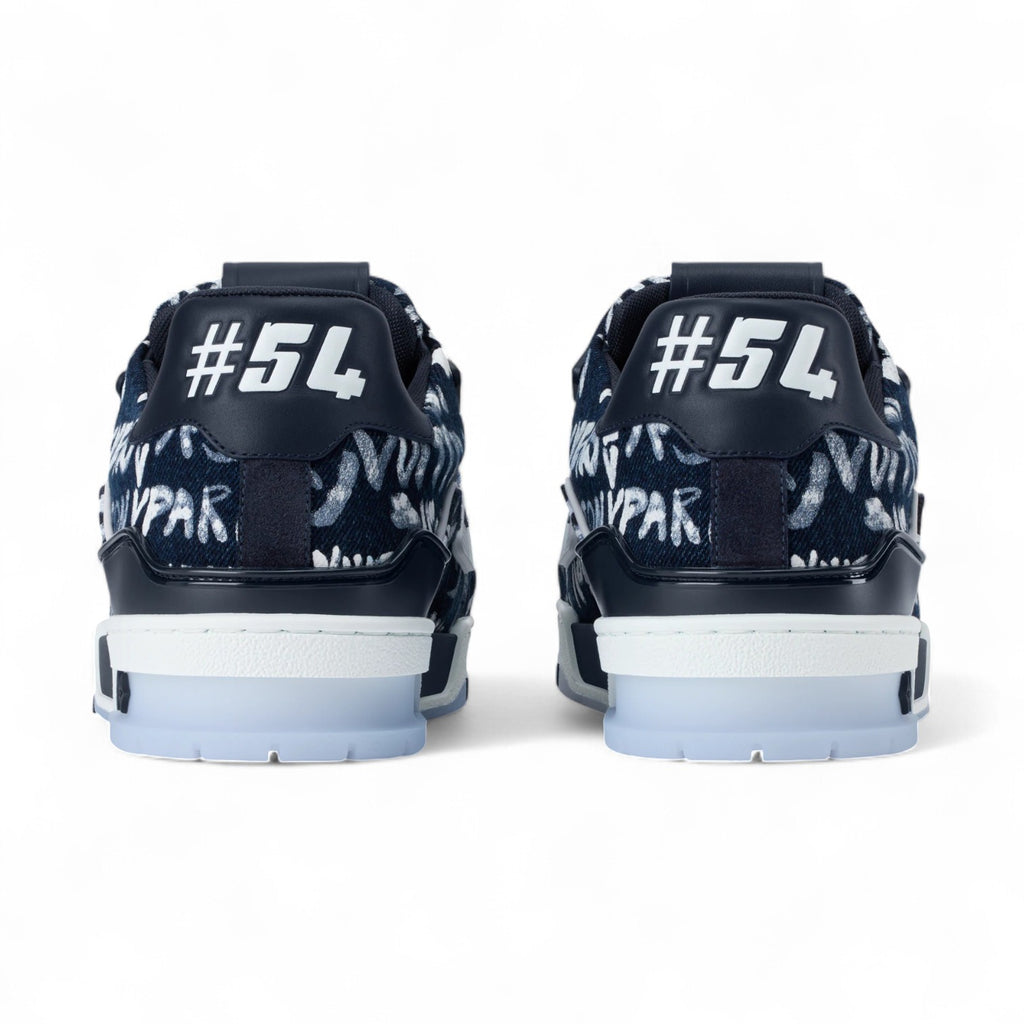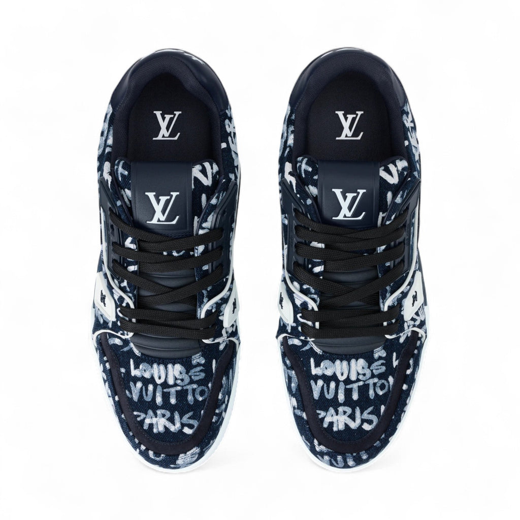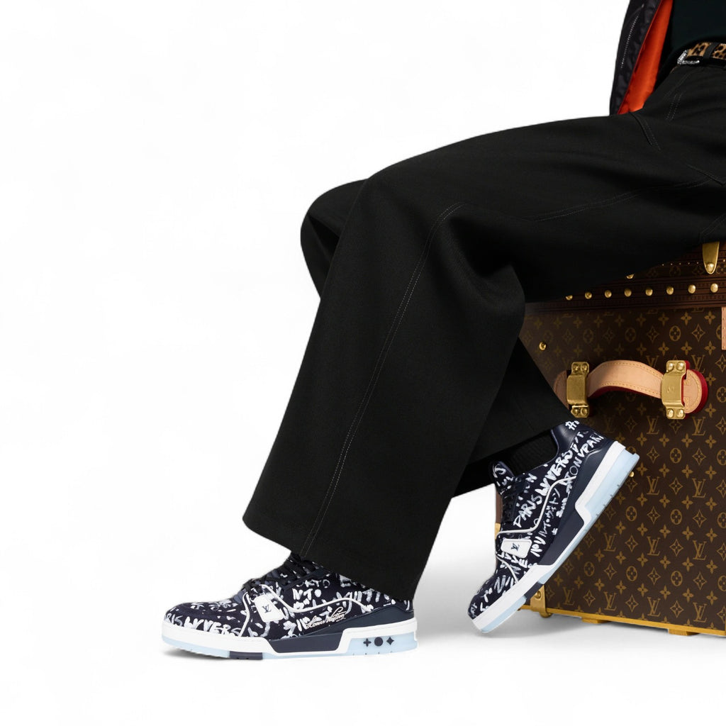 يأتي هذا الإصدار من حذاء LV Trainer الرياضي من قماش الدنيم بطبعة LV Scribble التي ابتكرها نيجو لتعاونه مع فاريل ويليامز وستوديو لويس فويتون للرجال. يمزج هذا الحذاء توقيعات الدار مع لمسات من اليابان، ليكمل هذا الحذاء الرياضي الأيقوني، الذي صممه فيرجيل أبلوه في الأصل. يتميز هذا الموديل بنعل خارجي مطاطي تقني مزين بزهور مونوغرام.