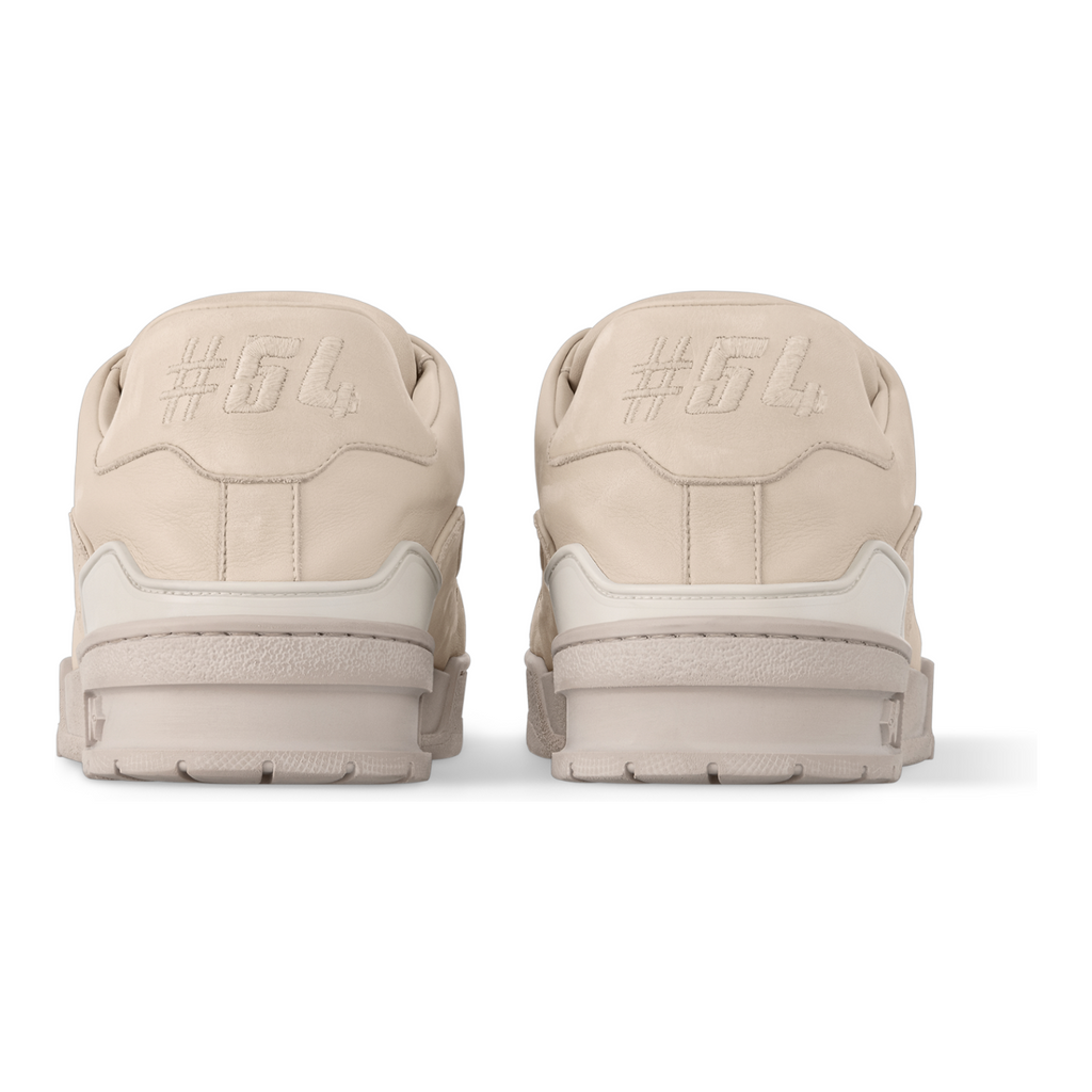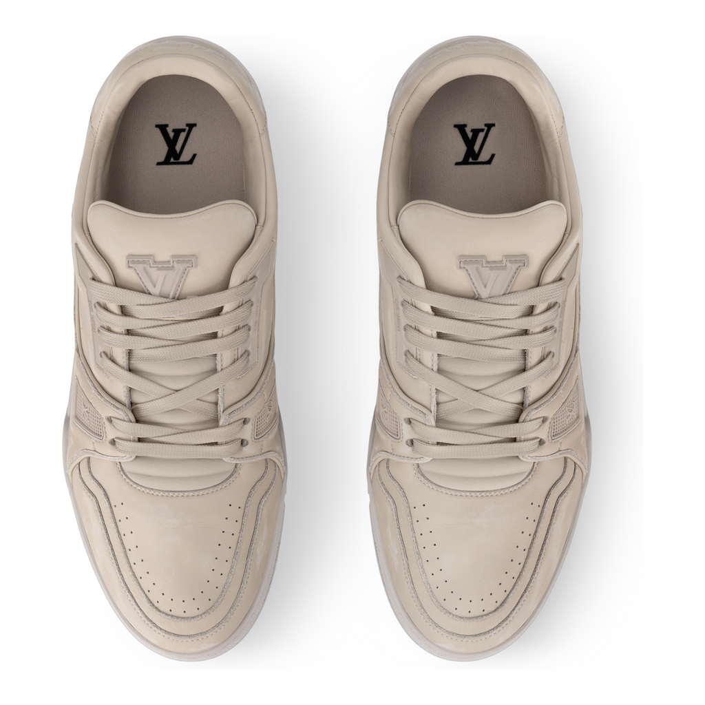 يُعاد تصميم حذاء LV Trainer الرياضي الشهير هذا الموسم بجلد عجل ناعم بمظهر عتيق ذي لمسة عتيقة. ويكتمل هذا التصميم بتوقيعات مطرزة: شعار لويس فويتون مكتوبًا على الجانب ورقم 54 على الخلف، في إشارة إلى عام 1854، تاريخ تأسيس الدار. النعل الخارجي المطاطي متناسق الألوان مزين بثلاث زهور مونوغرام.