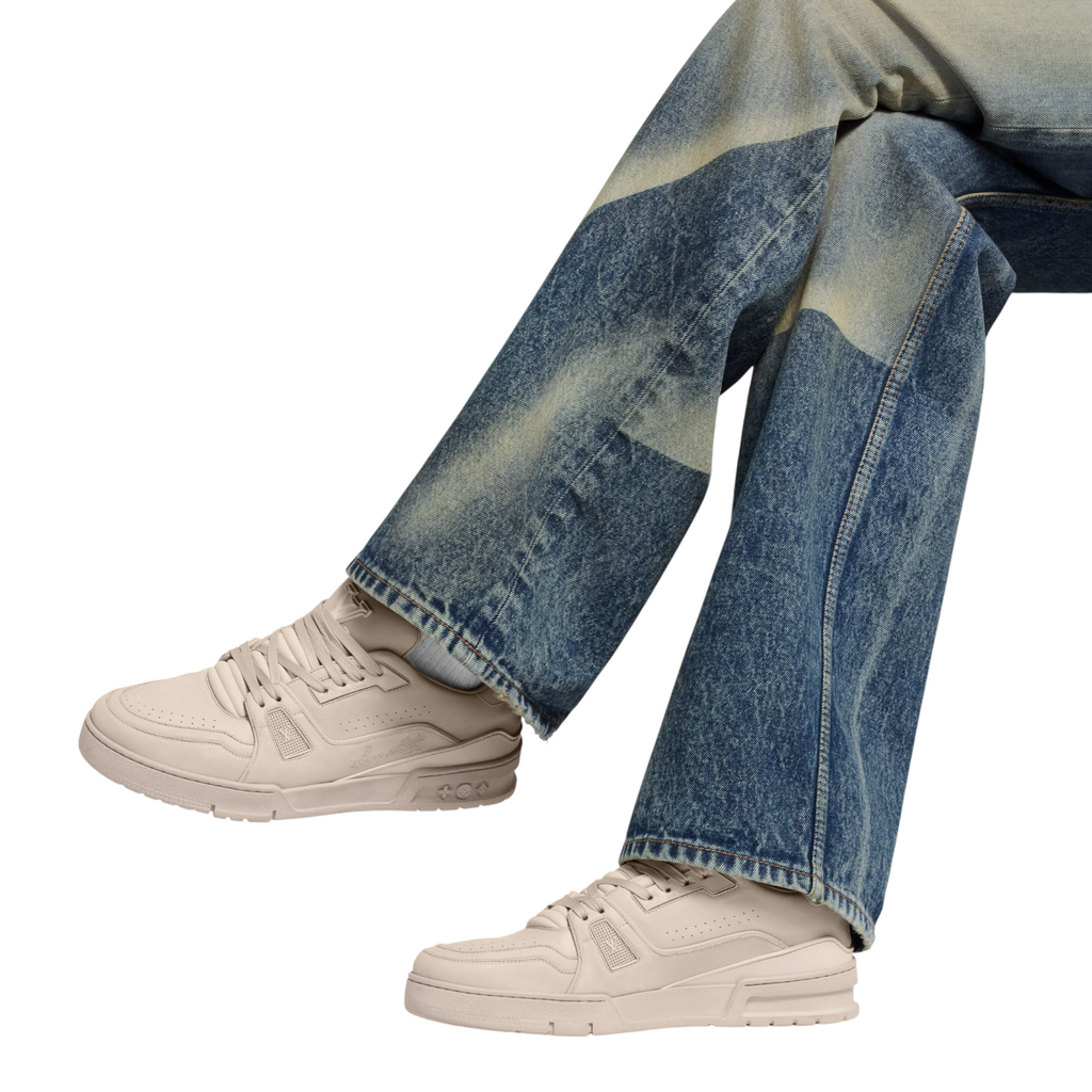 حذاء رياضي رجالي من لويس فيتون، مصنوع من جلد العجل بتأثير عتيق، لون بيج، بتصميم عتيق