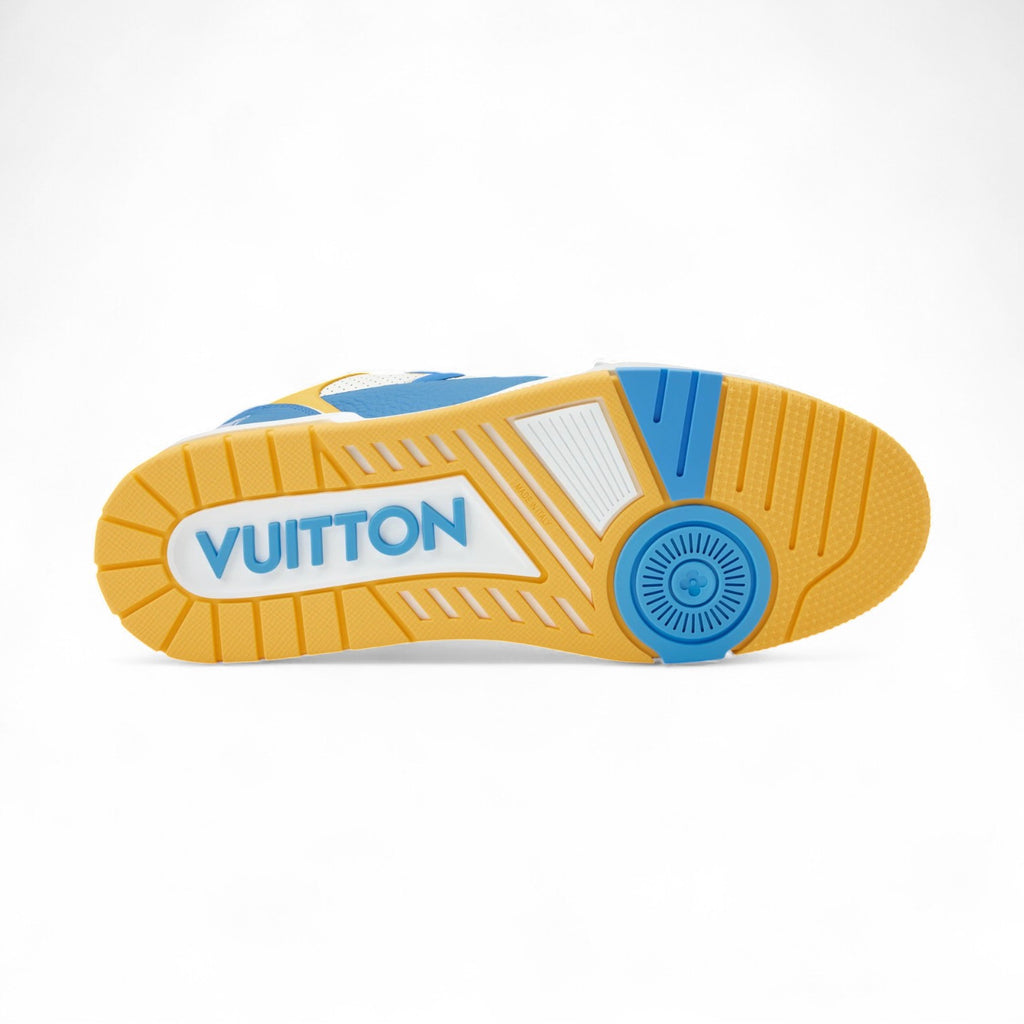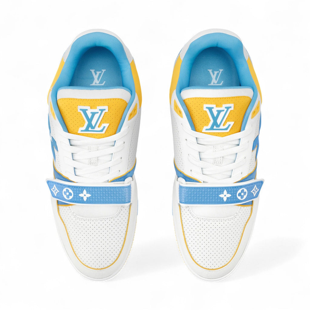 حذاء LV Trainer الرياضي الشهير يُعاد تصميمه بجلد عجل مثقب وألوان زاهية مستوحاة من الفرق الرياضية الجامعية. يتميز هذا الموديل بتوقيعاته البارزة، بما في ذلك زهرة مونوغرام كبيرة على الجانب وشعار لويس آند فويتون غير المتماثل على الظهر. كما يتميز بحزام فيلكرو مزين بزهور مونوغرام.
