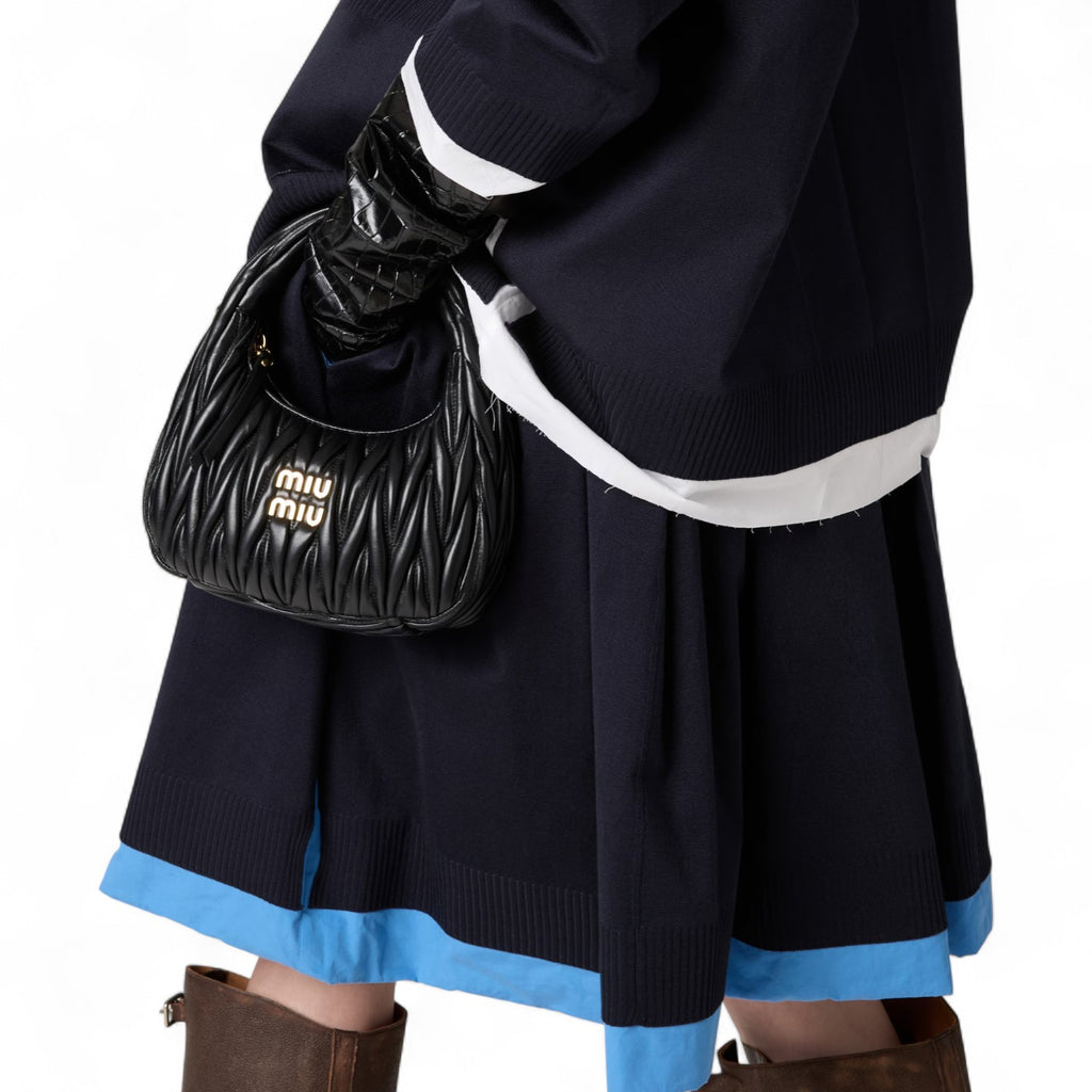 The Wander bag is reinterpreted season after season, becoming an iconic accessory of Miu Miu collections. Made of matelassé nappa leather, the bag is characterized by the sophisticated, three-dimensional effect created by the refined workmanship. The hobo shape, blending retro inspirations and contemporary elegance, becomes a new synonym of modern femininity.