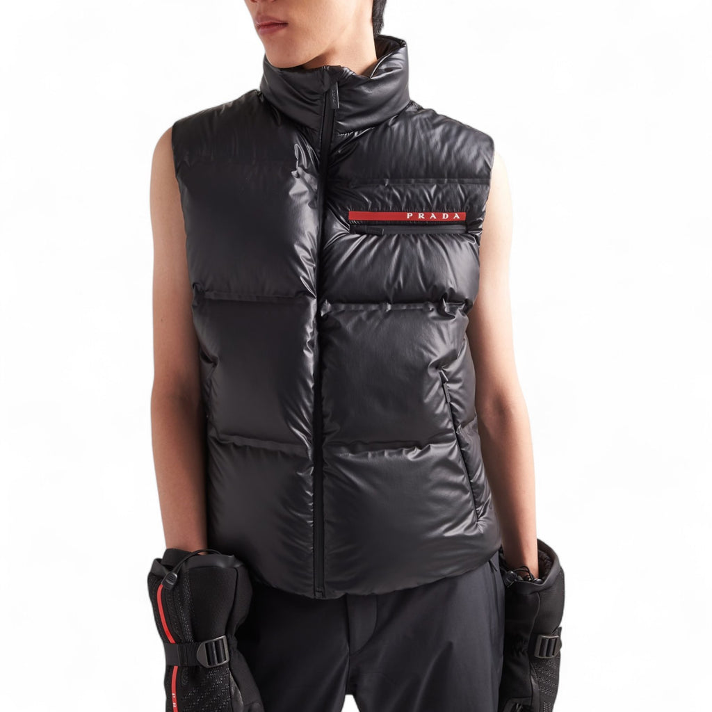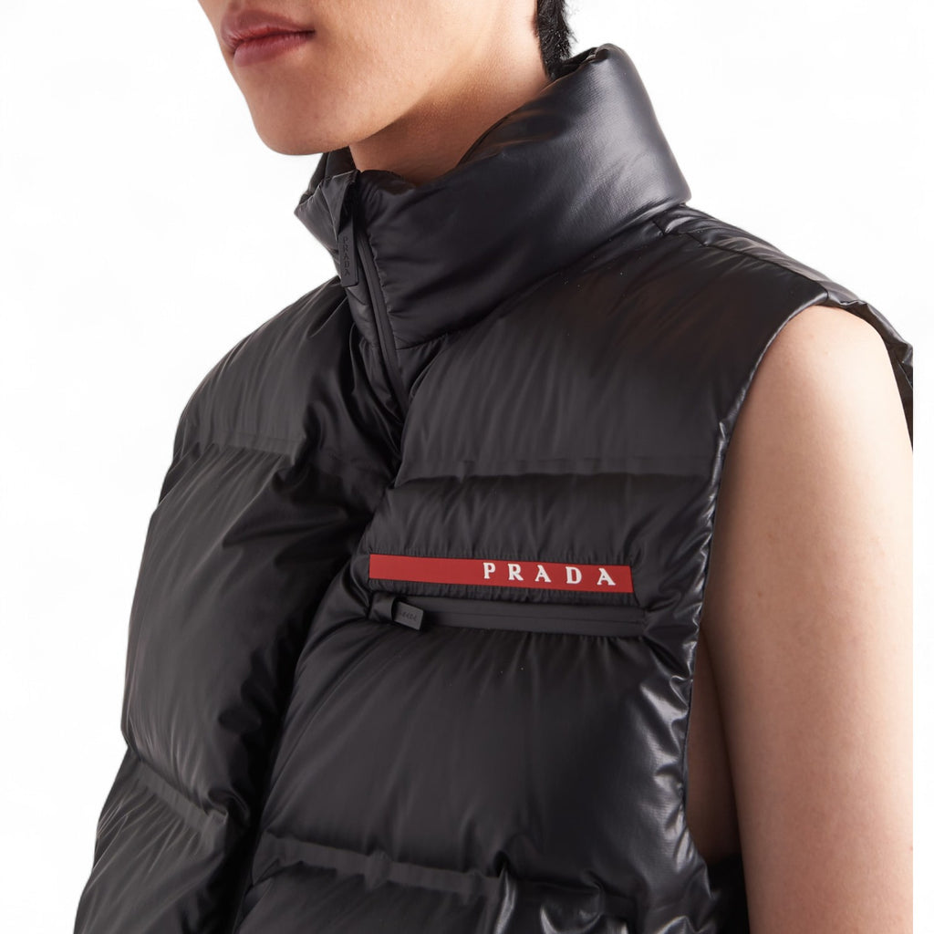 This down vest is made of Light Nylon, a distinctive two-layer technical fabric of Prada Linea Rossa. Windproof and abrasion resistant, the multifunctional material with high technical performance guarantees waterproofness and breathability. The down and Graphene® padding favors high thermal conductivity.