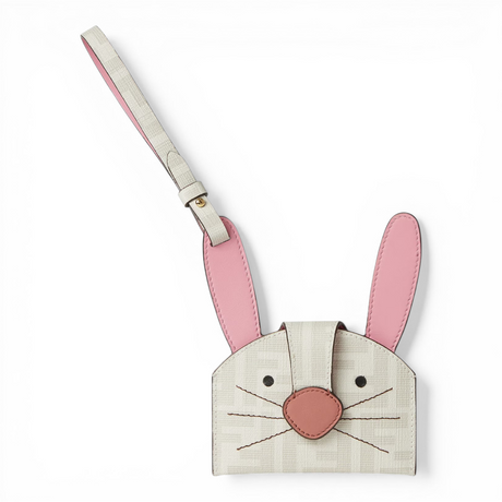 Fendi Best Friends Forever card holder with rabbit-head design. Features an internal compartment and clasp with bridge and hidden press stud. Leather strap to attach it to bags and belts. Made of fabric with the iconic FF motif in white and pink details. Gold-finish metalware.