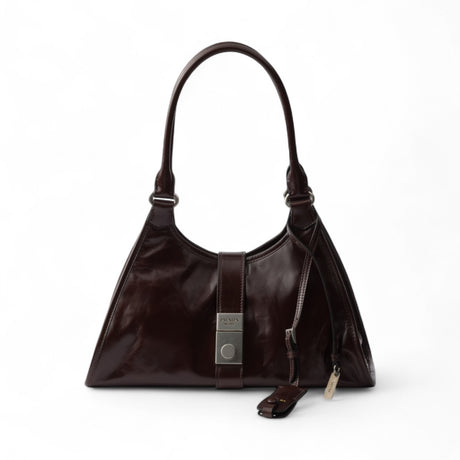 حقيبة توت متوسطة من الجلد البني الداكن برادا