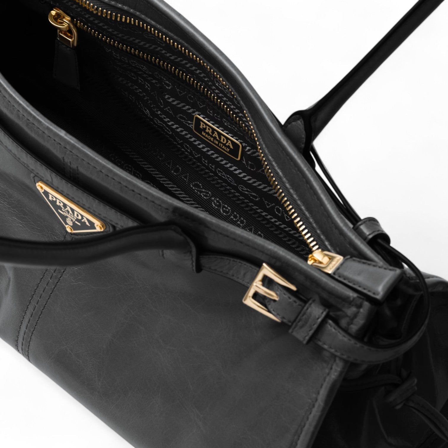 - Nappa and nylon interior with center zipper compartment and zipper patch pocket