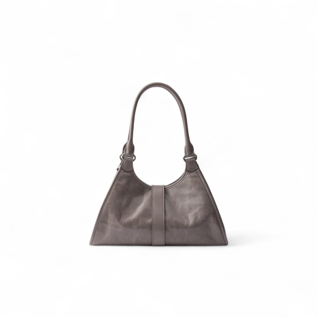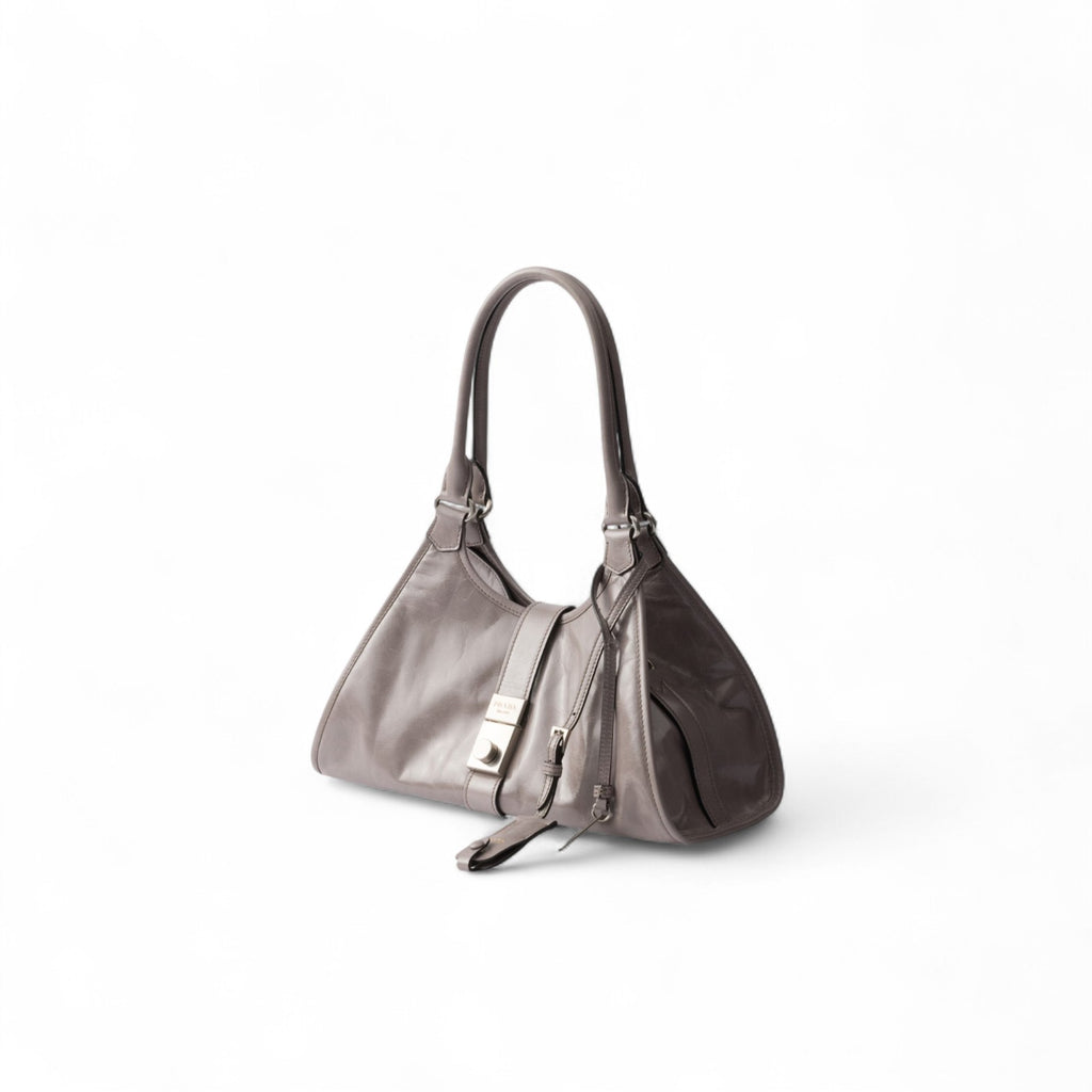 Geometric lines and refined artisan details define this bag with soft volumes. The trapezoidal silhouette features elongated handles to be worn with ease also as a shoulder bag. The vertical clasp inspired by the archives and the leather mirror complete the accessory with a sophisticated note.