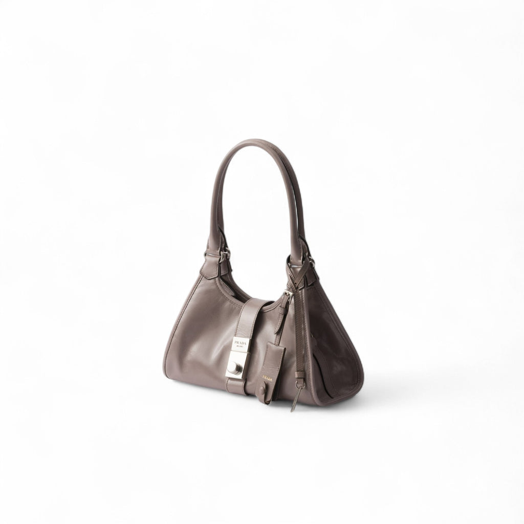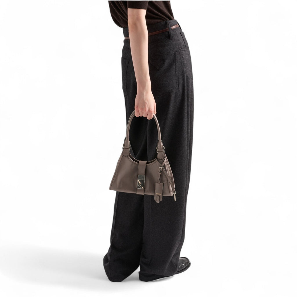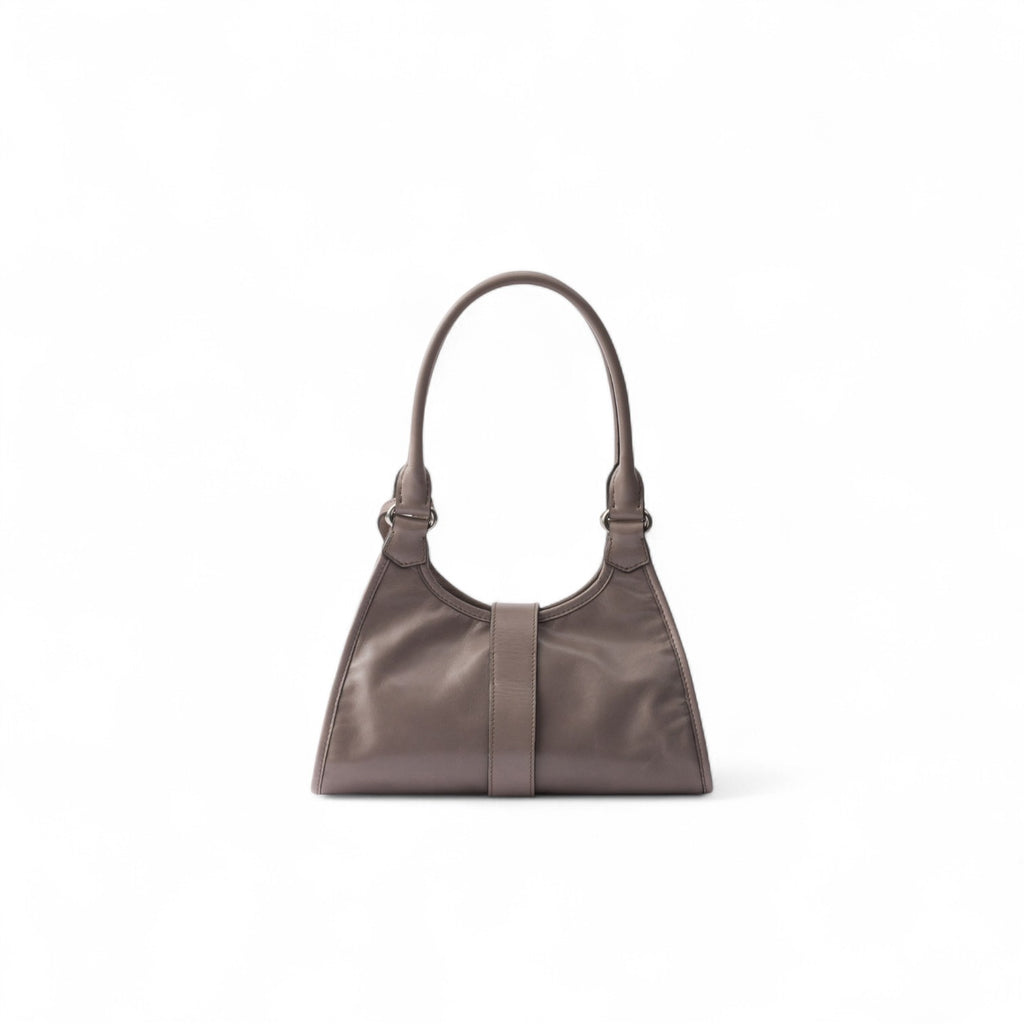 Geometric lines and refined artisan details define this bag with soft volumes. The trapezoidal silhouette features elongated handles for easy wear, also as a shoulder bag. The vertical clasp, inspired by archive designs, and the leather mirror case complete the accessory with a sophisticated note.