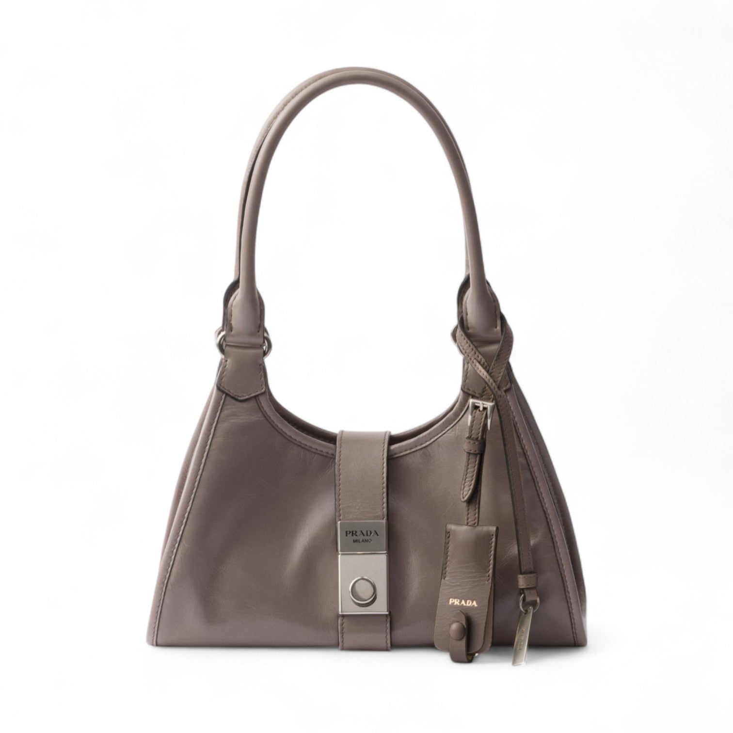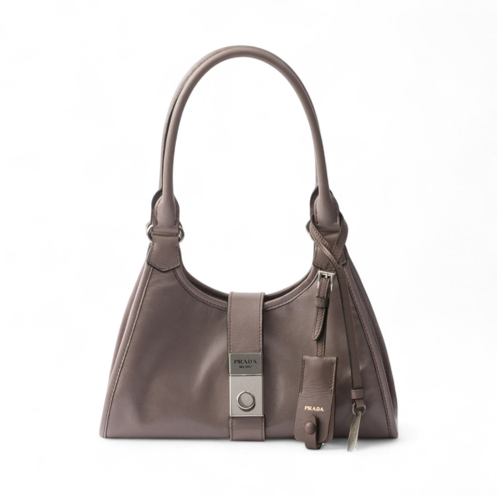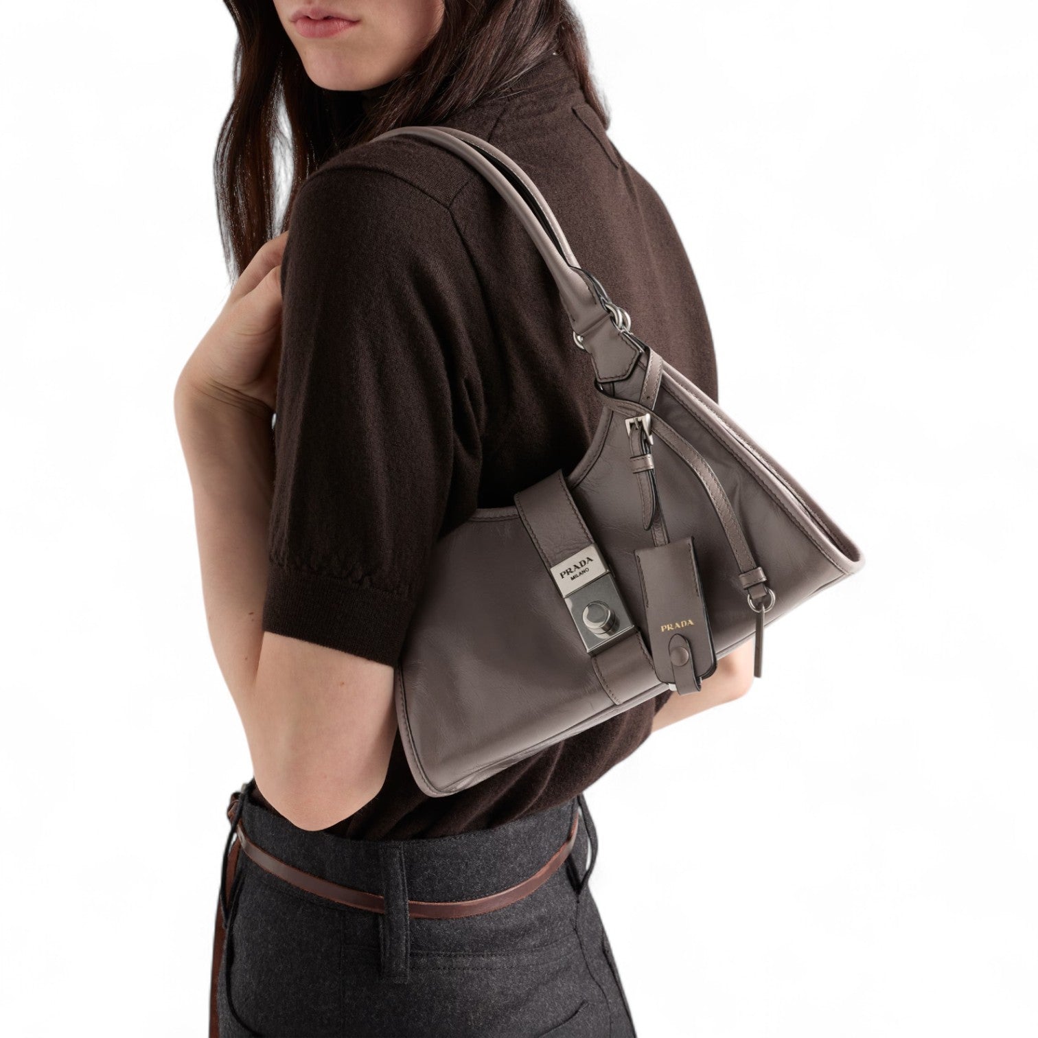 Geometric lines and refined artisan details define this bag with soft volumes. The trapezoidal silhouette features elongated handles for easy wear, also as a shoulder bag. The vertical clasp, inspired by archive designs, and the leather mirror case complete the accessory with a sophisticated note.